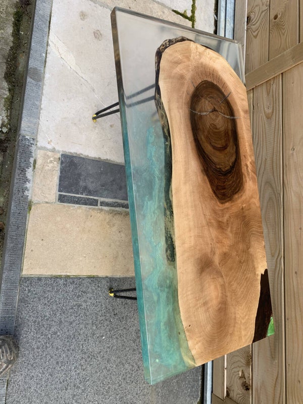 Zeer mooie bijzet tafel in Epoxy iepe houtenschaal met 3D effect zweven on de wolken 600mmL 400mm B 400mm H