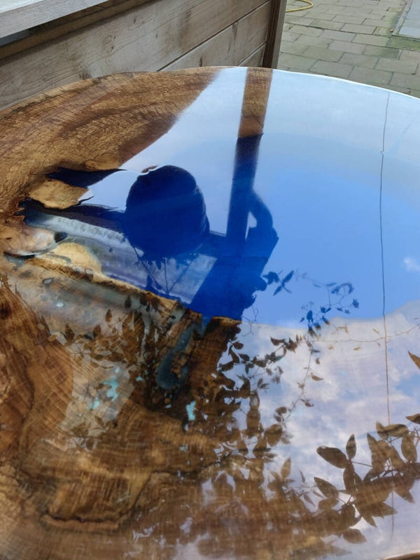 mooie beuken bijzet tafel 60cm doorsnee bewerkt met blauw epoxy kan led licht geinstaleerd worden